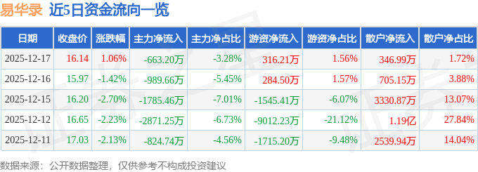 12月17日的资金流向数据方面,主力资金净流出663.2万元,占总成交额3.28%,游资资金净流入316.21万元,占总成交额1.56%,散户资金净流入346.99万元,占总成交额1.72%。