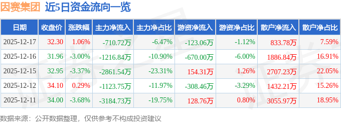 证券之星消息,截至2025年12月17日收盘,因赛集团(300781)报收于32.3元,上涨1.06%,换手率2.84%,成交量3.44万手,成交额1.1亿元。