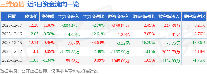 证券之星消息,截至2025年12月17日收盘,三维通信(002115)报收于12.2元,上涨1.08%,换手率23.06%,成交量173.43万手,成交额20.75亿元。
