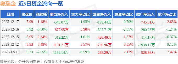 证券之星消息,截至2025年12月17日收盘,奥瑞金(002701)报收于5.99元,上涨1.18%,换手率1.84%,成交量47.01万手,成交额2.83亿元。