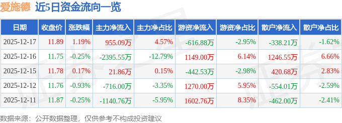 12月17日的资金流向数据方面,主力资金净流入955.09万元,占总成交额4.57%,游资资金净流出616.88万元,占总成交额2.95%,散户资金净流出338.21万元,占总成交额1.62%。