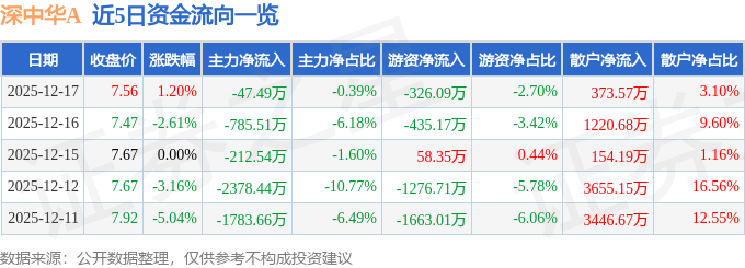 证券之星消息,截至2025年12月17日收盘,深中华A(000017)报收于7.56元,上涨1.2%,换手率3.65%,成交量16.1万手,成交额1.21亿元。