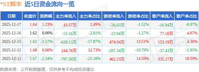 证券之星消息,截至2025年12月17日收盘,*ST辉丰(002496)报收于1.64元,上涨1.23%,换手率0.97%,成交量10.8万手,成交额1752.15万元。