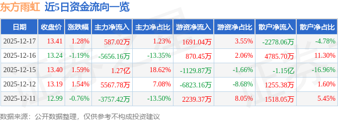证券之星消息,截至2025年12月17日收盘,东方雨虹(002271)报收于13.41元,上涨1.28%,换手率1.88%,成交量35.92万手,成交额4.77亿元。