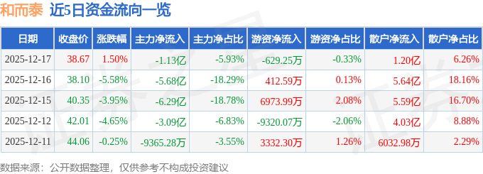 证券之星消息,截至2025年12月17日收盘,和而泰(002402)报收于38.67元,上涨1.5%,换手率6.19%,成交量49.88万手,成交额19.13亿元。