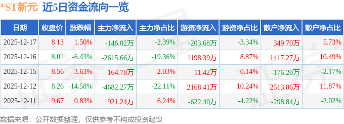 证券之星消息,截至2025年12月17日收盘,*ST新元(300472)报收于8.13元,上涨1.5%,换手率2.9%,成交量7.67万手,成交额6100.32万元。