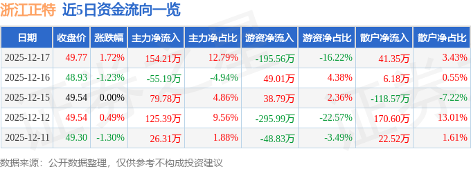 证券之星消息,截至2025年12月17日收盘,浙江正特(001238)报收于49.77元,上涨1.72%,换手率0.24%,成交量2449.0手,成交额1205.84万元。