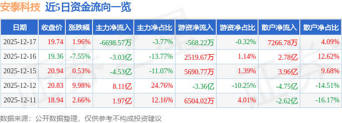 证券之星消息,截至2025年12月17日收盘,安泰科技(000969)报收于19.74元,上涨1.96%,换手率8.8%,成交量91.01万手,成交额17.77亿元。