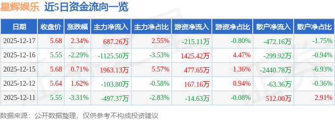 证券之星消息,截至2025年12月17日收盘,星辉娱乐(300043)报收于5.68元,上涨2.34%,换手率3.88%,成交量48.21万手,成交额2.7亿元。
