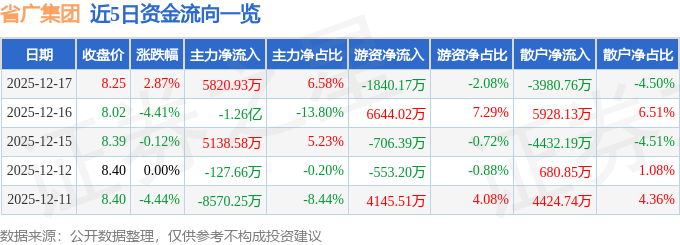 证券之星消息,截至2025年12月17日收盘,省广集团(002400)报收于8.25元,上涨2.87%,换手率6.31%,成交量108.9万手,成交额8.84亿元。