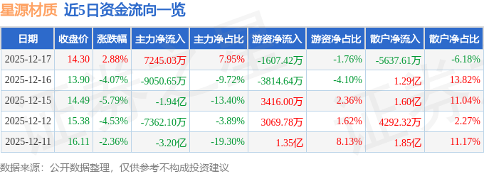 证券之星消息,截至2025年12月17日收盘,星源材质(300568)报收于14.3元,上涨2.88%,换手率5.3%,成交量64.61万手,成交额9.12亿元。