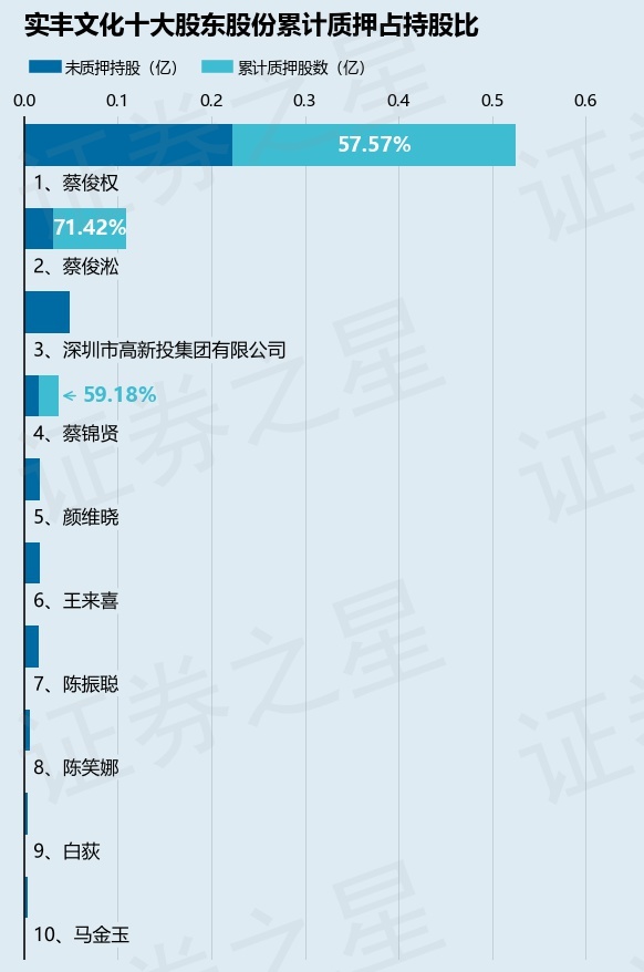 截止本公告日,股东蔡俊权已累计质押股份3026.0万股,占其持股总数的57.57%,股东蔡俊淞已累计质押股份780.0万股,占其持股总数的71.42%,股东蔡锦贤已累计质押股份220.0万股,占其持股总数的59.18%。本次质押后实丰文化十大股东的累计质押股份占持股比例(占持股比例的计算以公司最新一期财务报表公布的十大股东的持股总数为基准)见下图:
