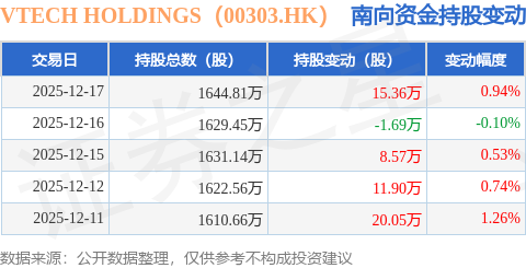 证券之星消息,12月17日南向资金增持15.36万股VTECH HOLDINGS(00303.HK)。近5个交易日中,获南向资金增持的有4天,累计净增持54.19万股。近20个交易日中,获南向资金增持的有16天,累计净增持268.89万股。截至目前,南向资金持有VTECH HOLDINGS(00303.HK)1644.81万股,占公司已发行普通股的6.49%。