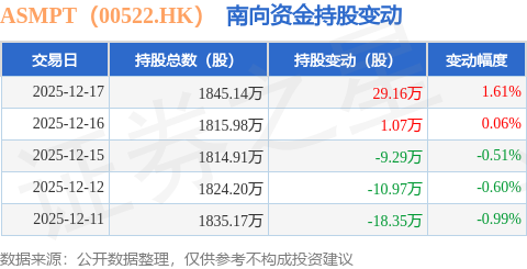 证券之星消息,12月17日南向资金增持29.16万股ASMPT(00522.HK)。近5个交易日中,获南向资金减持的有3天,累计净减持8.38万股。近20个交易日中,获南向资金减持的有11天,累计净减持744.71万股。截至目前,南向资金持有ASMPT(00522.HK)1845.14万股,占公司已发行普通股的4.41%。