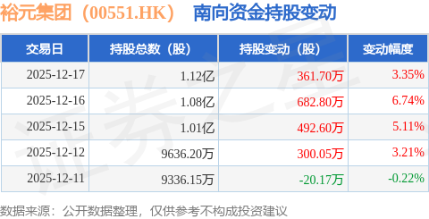 证券之星消息,12月17日南向资金增持361.7万股裕元集团(00551.HK)。近5个交易日中,获南向资金增持的有4天,累计净增持1816.98万股。近20个交易日中,获南向资金增持的有9天,累计净增持1191.98万股。截至目前,南向资金持有裕元集团(00551.HK)1.12亿股,占公司已发行普通股的6.95%。