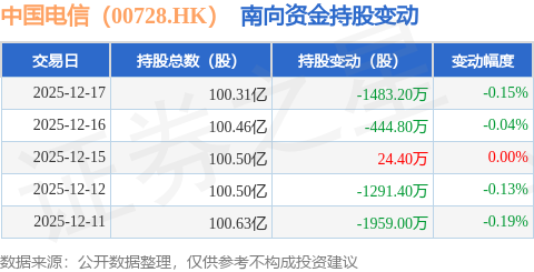 证券之星消息,12月17日南向资金减持1483.2万股中国电信(00728.HK)。近5个交易日中,获南向资金减持的有4天,累计净减持5154.0万股。近20个交易日中,获南向资金减持的有10天,累计净减持303.22万股。截至目前,南向资金持有中国电信(00728.HK)100.31亿股,占公司已发行普通股的72.27%。