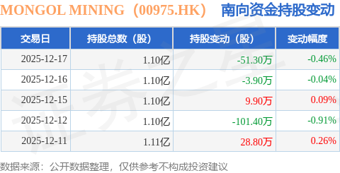 证券之星消息,12月17日南向资金减持51.3万股MONGOL MINING(00975.HK)。近5个交易日中,获南向资金减持的有3天,累计净减持117.9万股。近20个交易日中,获南向资金减持的有15天,累计净减持428.7万股。截至目前,南向资金持有MONGOL MINING(00975.HK)1.1亿股,占公司已发行普通股的10.55%。