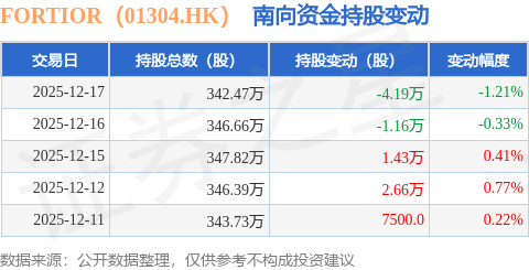 证券之星消息,12月17日南向资金减持4.19万股FORTIOR(01304.HK)。近5个交易日中,获南向资金减持的有2天,累计净减持5100.0股。近20个交易日中,获南向资金减持的有9天,累计净减持1.31万股。截至目前,南向资金持有FORTIOR(01304.HK)342.47万股,占公司已发行普通股的15.88%。