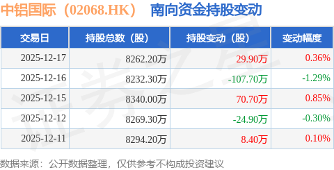证券之星消息,12月17日南向资金增持29.9万股中铝国际(02068.HK)。近5个交易日中,获南向资金减持的有2天,累计净减持23.6万股。近20个交易日中,获南向资金增持的有10天,累计净增持61.8万股。截至目前,南向资金持有中铝国际(02068.HK)8262.2万股,占公司已发行普通股的20.67%。