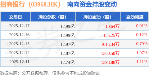 证券之星消息,12月17日南向资金增持10.64万股招商银行(03968.HK)。近5个交易日中,获南向资金增持的有5天,累计净增持3940.53万股。近20个交易日中,获南向资金增持的有20天,累计净增持1.19亿股。截至目前,南向资金持有招商银行(03968.HK)12.99亿股,占公司已发行普通股的28.28%。