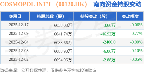 证券之星消息,12月17日南向资金减持3.66万股COSMOPOL INT'L(00120.HK)。近5个交易日中,获南向资金减持的有5天,累计净减持59.76万股。近20个交易日中,获南向资金减持的有20天,累计净减持277.5万股。截至目前,南向资金持有COSMOPOL INT'L(00120.HK)6038.08万股,占公司已发行普通股的3.67%。