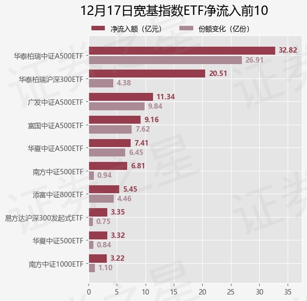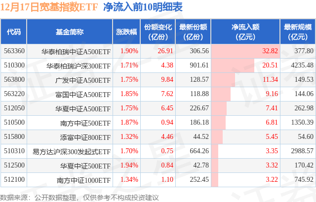 当日有48只宽基指数ETF基金出现资金净流入,其中净流入排首位的是华泰柏瑞中证A500ETF(563360),份额增加了26.91亿份,净流入额为32.82亿元。