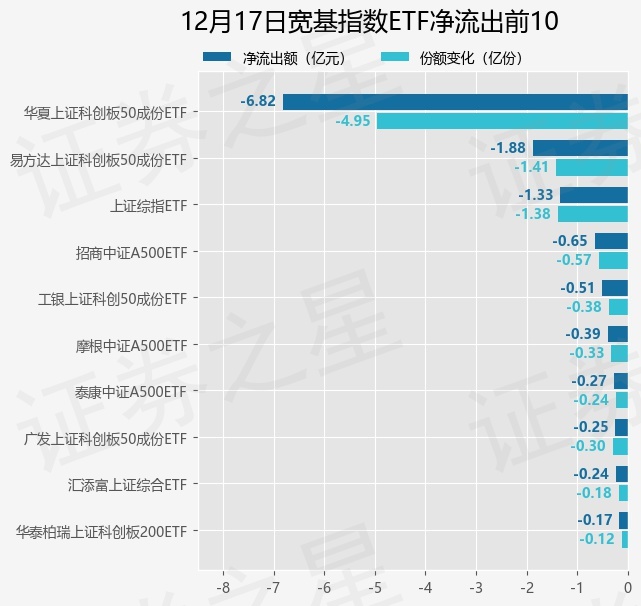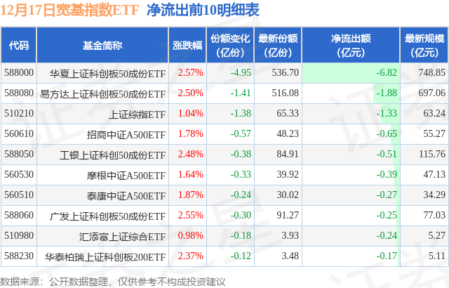 当日有45只宽基指数ETF基金出现资金净流出,其中净流出排首位的是华夏上证科创板50成份ETF(588000),份额减少了4.95亿份,净流出额为6.82亿元。