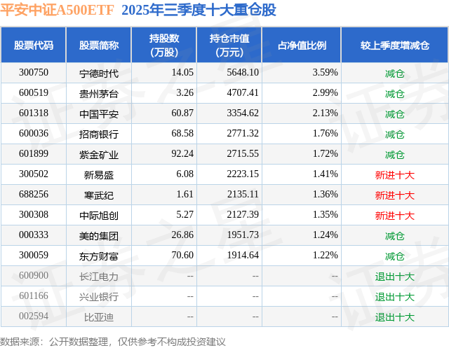 平安中证A500ETF基金成立于2025年3月26日,基金经理为李严,基金跟踪标的为中证A500指数,成立以来超额回报为4.85%,近一个月超额回报为0.58%。最新披露的基金持仓数据显示,截止2025年9月30日,该基金第一大重仓股为宁德时代(300750),持股占比为3.59%。