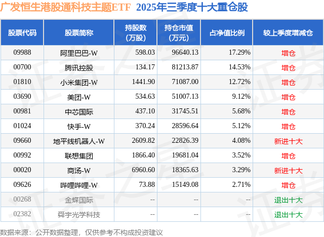 广发恒生港股通科技主题ETF基金成立于2025年6月26日,基金经理为夏浩洋,基金跟踪标的为恒生港股通科技主题指数,成立以来超额回报为-1.3%,近一个月超额回报为-0.1%。最新披露的基金持仓数据显示,截止2025年9月30日,该基金第一大重仓股为阿里巴巴-W(09988),持股占比为17.29%。
