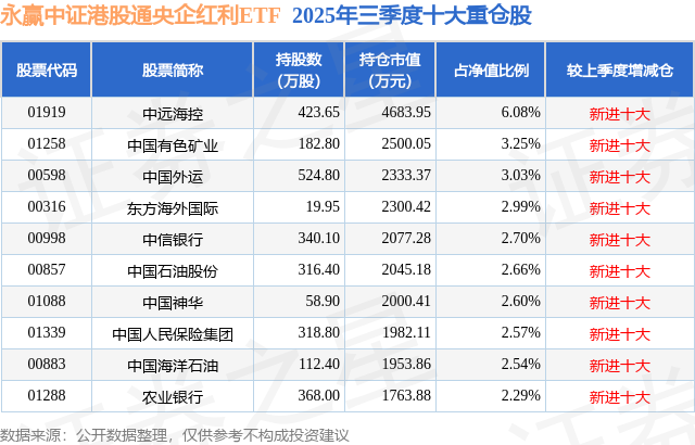 永赢中证港股通央企红利ETF基金成立于2025年7月23日,基金经理为刘庭宇 蔡路平,基金跟踪标的为中证港股通央企红利指数,成立以来超额回报为0.0%,近一个月超额回报为-0.14%。最新披露的基金持仓数据显示,截止2025年9月30日,该基金第一大重仓股为中远海控(01919),持股占比为6.08%。