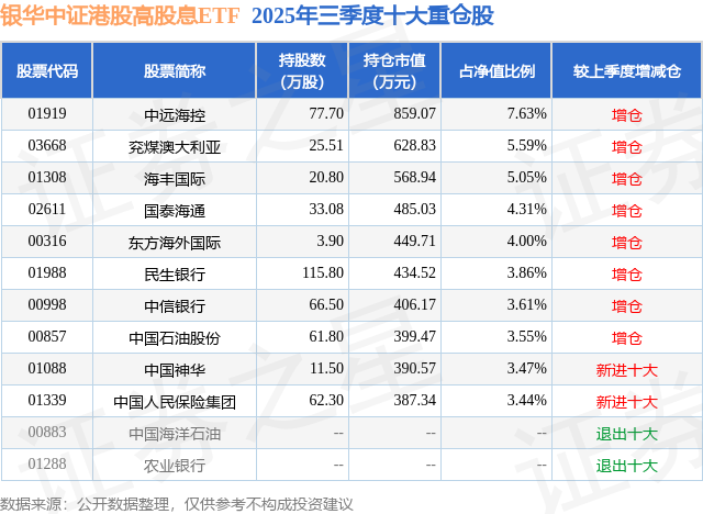 银华中证港股高股息ETF基金成立于2024年8月23日,基金经理为张亦驰,基金跟踪标的为中证港股通高股息投资港元指数,成立以来超额回报为-1.68%,近一个月超额回报为-1.58%。最新披露的基金持仓数据显示,截止2025年9月30日,该基金第一大重仓股为中远海控(01919),持股占比为7.63%。