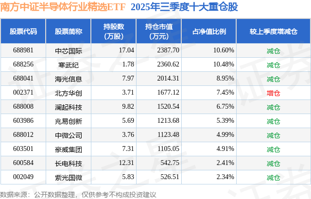 南方中证半导体行业精选ETF基金成立于2024年10月31日,基金经理为赵卓雄 何典鸿,基金跟踪标的为中证半导体行业精选指数,成立以来超额回报为-2.73%,近一个月超额回报为0.41%。最新披露的基金持仓数据显示,截止2025年9月30日,该基金第一大重仓股为中芯国际(688981),持股占比为10.6%。
