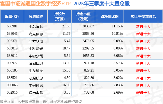 富国中证诚通国企数字经济ETF基金成立于2025年5月21日,基金经理为苏华清,基金跟踪标的为中证诚通国企数字经济指数,成立以来超额回报为2.38%,近一个月超额回报为0.62%。最新披露的基金持仓数据显示,截止2025年9月30日,该基金第一大重仓股为中芯国际(688981),持股占比为11.15%。
