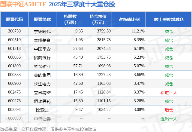国联中证A50ETF基金成立于2025年3月26日,基金经理为杜超,基金跟踪标的为中证A50指数,成立以来超额回报为13.66%,近一个月超额回报为0.41%。最新披露的基金持仓数据显示,截止2025年9月30日,该基金第一大重仓股为宁德时代(300750),持股占比为11.21%。