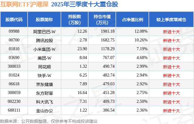 互联网ETF沪港深基金成立于2025年6月18日,基金经理为赵肖萌,基金跟踪标的为中证沪港深互联网人民币指数,成立以来超额回报为-1.24%,近一个月超额回报为0.28%。最新披露的基金持仓数据显示,截止2025年9月30日,该基金第一大重仓股为阿里巴巴-W(09988),持股占比为12.08%。