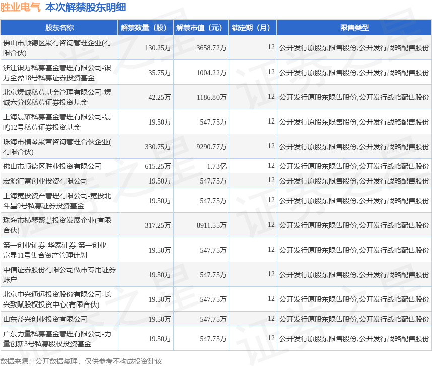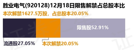 证券之星消息,根据市场公开信息整理,胜业电气(920128)于12月18日将有1627.5万股限售股份解禁,为公司公开发行原股东限售股份,公开发行战略配售股份,占公司总股本20.05%。(本次数据根据历史公告整理得出,实际情况以上市公司最新公告为准)最近一年内,该股累计解禁486.0万股,占总股本的5.99%。本次解禁后,公司还有4295.5万股限售股份,占总股本52.91%。具体如下图所示: