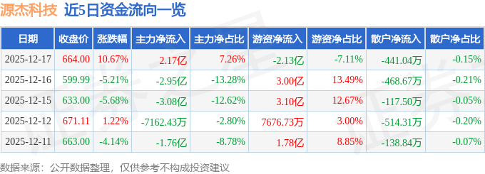 证券之星消息,截至2025年12月17日收盘,源杰科技(688498)报收于664.0元,上涨10.67%,换手率7.75%,成交量4.66万手,成交额29.91亿元。