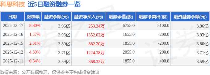 科思科技融资融券信息显示,融资方面,当日融资买入5887.16万元,融资偿还5633.82万元,融资净买入253.34万元,连续3日净买入累计2487.56万元。融券方面,融券卖出5100.0股,融券偿还0.0股,融券余量6755.0股,融券余额46.19万元。融资融券余额3.96亿元。