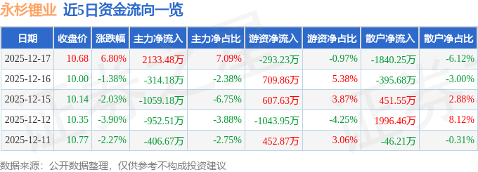 证券之星消息,截至2025年12月17日收盘,永杉锂业(603399)报收于10.68元,上涨6.8%,换手率5.65%,成交量28.97万手,成交额3.01亿元。