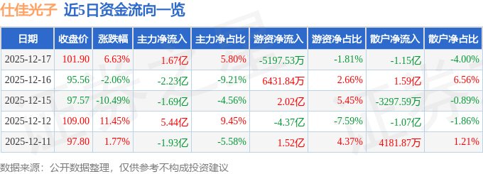 证券之星消息,截至2025年12月17日收盘,仕佳光子(688313)报收于101.9元,上涨6.63%,换手率6.34%,成交量29.07万手,成交额28.79亿元。
