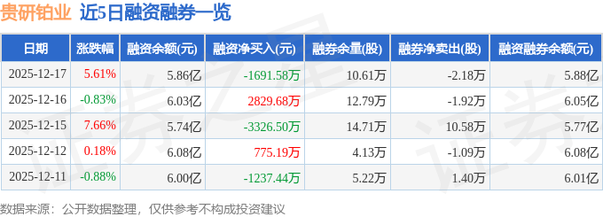 贵研铂业融资融券信息显示,融资方面,当日融资买入1.59亿元,融资偿还1.75亿元,融资净偿还1691.58万元。融券方面,融券卖出8000.0股,融券偿还2.98万股,融券余量10.61万股,融券余额201.59万元。融资融券余额5.88亿元。
