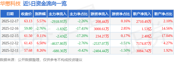 证券之星消息,截至2025年12月17日收盘,华懋科技(603306)报收于63.13元,上涨5.57%,换手率6.43%,成交量21.18万手,成交额12.92亿元。