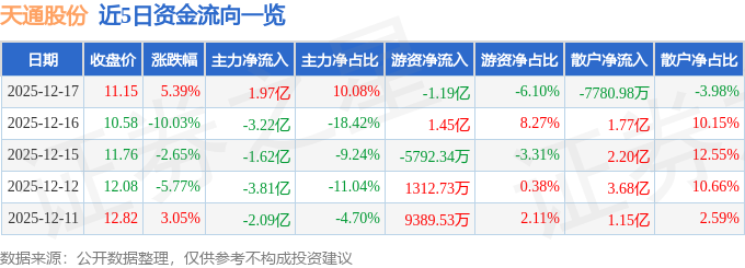 证券之星消息,截至2025年12月17日收盘,天通股份(600330)报收于11.15元,上涨5.39%,换手率14.55%,成交量179.49万手,成交额19.54亿元。