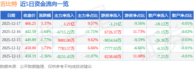 12月17日的资金流向数据方面,主力资金净流入1.21亿元,占总成交额9.57%,游资资金净流出1.21亿元,占总成交额9.56%,散户资金净流出18.12万元,占总成交额0.01%。