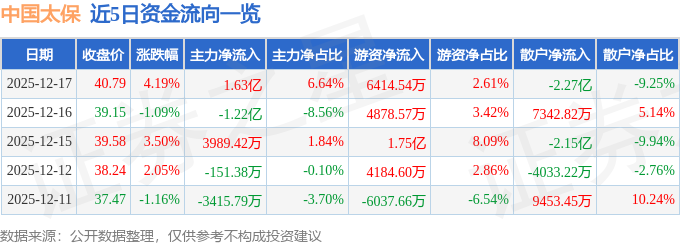 证券之星消息,截至2025年12月17日收盘,中国太保(601601)报收于40.79元,上涨4.19%,换手率0.89%,成交量60.74万手,成交额24.53亿元。