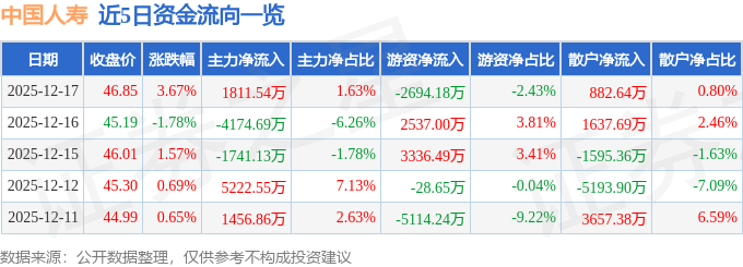 证券之星消息,截至2025年12月17日收盘,中国人寿(601628)报收于46.85元,上涨3.67%,换手率0.11%,成交量23.92万手,成交额11.1亿元。