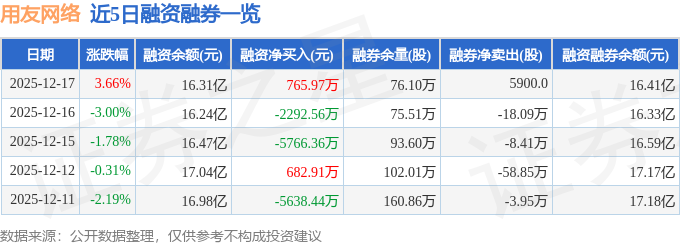 用友网络融资融券信息显示,融资方面,当日融资买入5635.76万元,融资偿还4869.79万元,融资净买入765.97万元。融券方面,融券卖出1.76万股,融券偿还1.17万股,融券余量76.1万股,融券余额968.7万元。融资融券余额16.41亿元。