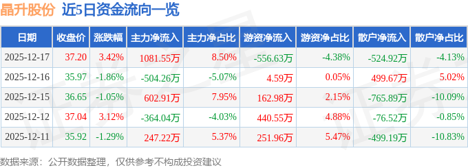 证券之星消息,截至2025年12月17日收盘,晶升股份(688478)报收于37.2元,上涨3.42%,换手率3.34%,成交量3.45万手,成交额1.27亿元。