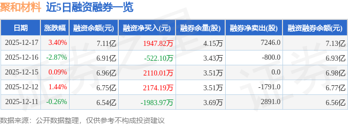 聚和材料融资融券信息显示,融资方面,当日融资买入5830.12万元,融资偿还3882.3万元,融资净买入1947.82万元。融券方面,融券卖出7846.0股,融券偿还600.0股,融券余量4.15万股,融券余额241.15万元。融资融券余额7.13亿元。