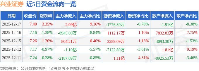 证券之星消息,截至2025年12月17日收盘,兴业证券(601377)报收于7.4元,上涨3.35%,换手率3.61%,成交量312.18万手,成交额22.77亿元。